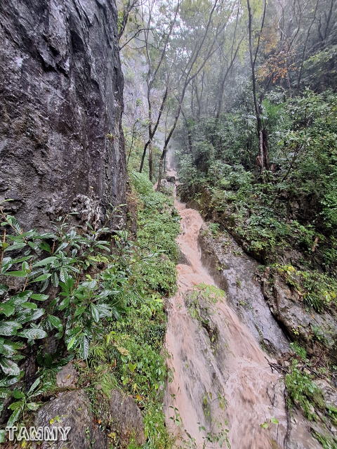 下流は泥水が濁流となって流れていました。さすがに、ここを沢登りするのは